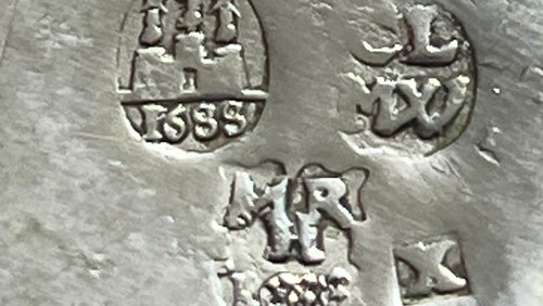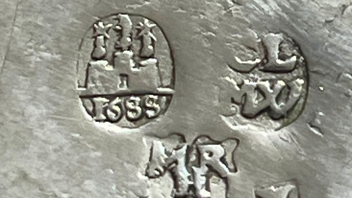 Der er både københavner-stemplet, mesterens stempel, guardeinens stempel og især det fjerde stempel, som sikkert er et bogstav, muligvis ”X”.